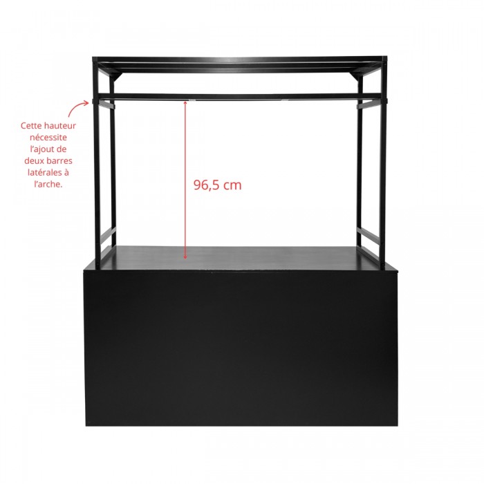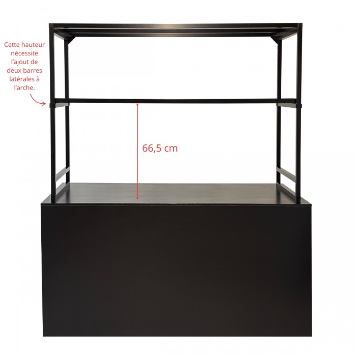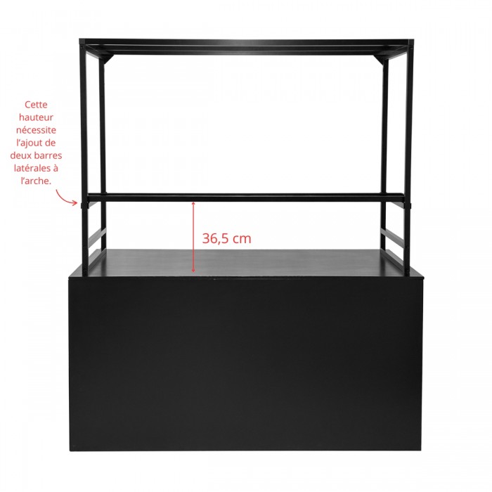 Facile à installer, la tablette se coulisse au centre de l’arche et s’ajuste selon vos besoins, pour un rendu visuel soigné. Pour personnaliser sa hauteur, pensez à louer les barres latérales assorties : elles permettent une fixation à trois niveaux différents.