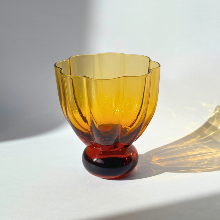 Inspiré de la fleur du même nom, ce verre se distingue par une forme florale, soulignée par un rebord festonné qui évoque la douceur des pétales. Sa teinte ambre, chaleureuse et lumineuse, crée une atmosphère à la fois rétro et sophistiquée.